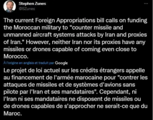 وأوضح أستاذ العلوم السياسية بجامعة سان فرانسيسكو، ستيفان زونيس، أن أمريكا تسعى إلى تمويل الجيش المغربي “لمواجهة هجمات الصواريخ والطائرات غير المأهولة التي تشنها إيران ووكلاؤها”، مؤكدا في تغريدة له على تويتر أن إيران ووكلاؤها لا يمتلكون صواريخ وطائرات بدون طيار قادرة على الاقتراب من المغرب.