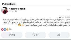 ونشر المستشار الجماعي في وقت لاحق من يوم أمس، تدوينة عبر حسابه بفايسبوك، معلنا سحبه للفيديو، حيث قال: “سحبت الفيديو الذي سجلته احتراما لأشخاص اتصلوا بي ولهم مكانة خاصة (…) وسأقول لأعداء النجاح سنواصل العمل”.