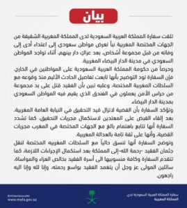 وأوردت السفارة السعودية بالمغرب، أنها تلقت من السلطات المغربية نبأ تعرض مواطن سعودي إلى اعتداء من قبل مجموعة أشخاص أدى إلى وفاته، بعد عراكٍ دار بينهم”، وفقا لبيان السفارة على موقع “تويتر”.