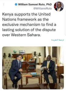 وأكد ويليام روتو، عبر حسابه الرسمي بتويتر، شروع حكومته في خطوات إنهاء وجود الكيان الانفصالي الوهمي في البلاد، وذلك عقب استقباله لناصر بوريطة، وزير الخارجية والتعاون الأفريقي والمغاربة المقيمين بالخارج، بقصر الرئاسة بنايروبي.