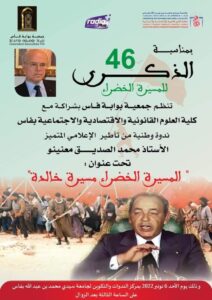 تنظم جمعية بوابة فاس بشراكة مع كلية العلوم القانونية والاقتصادية والاجتماعية بفاس، يوم 6 نونبر بمركز الندوات والتكوين بالجامعة، ندوة تحت عنوان: “المسيرة الخضراء مسيرة خالدة”.