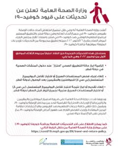 وأكدت وزارة الصحة العامة، في بيان لها، أن قرارها هذا يأتي في إطار استمرار انخفاض أعداد حالات الإصابة بفيروس كوفيد-19 في جميع أنحاء العالم وفي دولة قطر، مشيرة إلى مجموعة من التحديثات الأخرى للإجراءات المتبعة لمواجهة جائحة.