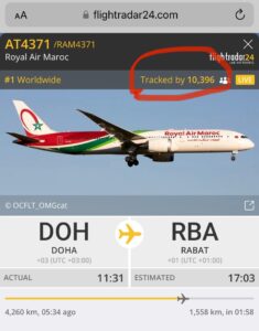 و يتابع المغاربة بشغف كبير مسار الطائرة المغربية في الأجواء، والتي تنقل عناصر أسود الأطلس من الدوحة في رحلة مباشرة اتجاه العاصمة الرباط، وذلك على الموقع العالمي الشهير FlightRadar24.