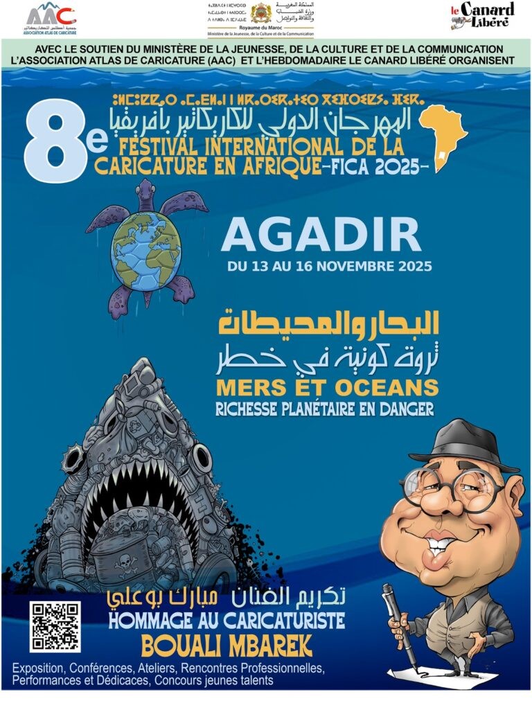 تحتضن مدينة أكادير ما بين 13 و 16 نونبر الجاري فعاليات الدورة الثامنة للمهرجان الدولي للكاريكاتير بإفريقيا (فيكا)، الذي تنظمه جمعية أطلس للكاريكاتير (AAC) وأسبوعية “لو كنار ليبيري”، بدعم من وزارة الشباب والثقافة والتواصل.